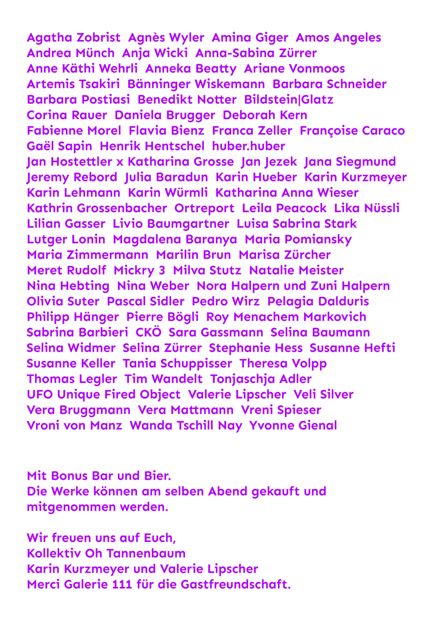 Agatha Zobrist, Agnès Wyler, Amina Giger, Amos Angeles, Andrea Münch, Anja Wicki, Anna-Sabina Zürrer, Anne Käthi Wehrli, Anneka Beatty, Ariane Vonmoos, Artemis Tsakiri, Bänninger Wiskemann, Barbara Schneider, Barbara Postiasi, Benedikt Notter, Bildstein|Glatz, Corina Rauer, Daniela Brugger, Deborah Kern, Fabienne Morel, Flavia Bienz, Franca Zeller, Françoise Caraco, Gaël Sapin, Henrik Hentschel, huber.huber, Jan Hostettler x Katharina Grosse, Jan Jezek, Jana Siegmund, Jeremy Rebord, Julia Barandun, Karin Hueber, Karin Kurzmeyer, Karin Lehmann, Karin Würmli, Katharina Anna Wieser, Kathrin Grossenbacher, Ortreport, Leila Peacock, Lika Nüssli, Lilian Gasser, Livio Baumgartner, Luisa Sabrina Stark, Lutger Lonin Magdalena Baranya, Maria Pomiansky, Maria Zimmermann, Marilin Brun, Marisa Zürcher, Meret Rudolf, Mickry 3, Milva Stutz, Natalie Meister, Nina Hebting, Nina Weber, Nora Halpern und Zuni Halpern, Pascal Sidler, Pedro Wirz, Pelagia Dalduris, Philipp Hänger, Pierre Bögli, Roy Menachem Markovich, Sabrina Barbieri, CKÖ, Sara Gassmann, Selina Baumann, Selina Widmer, Selina Zürrer, Stephanie Hess, Susanne Hefti, Susanne Keller, Tania Schuppisser, Theresa Volpp, Thomas Legler, Tim Wandelt, Tonjaschja Adler, UFO Unique Fired Object, Valerie Lipscher, Veli Silver, Vera Bruggmann, Vera Mattmann, Vreni Spieser, Vroni von Manz, Wanda Tschill Nay, Yvonne Gienal